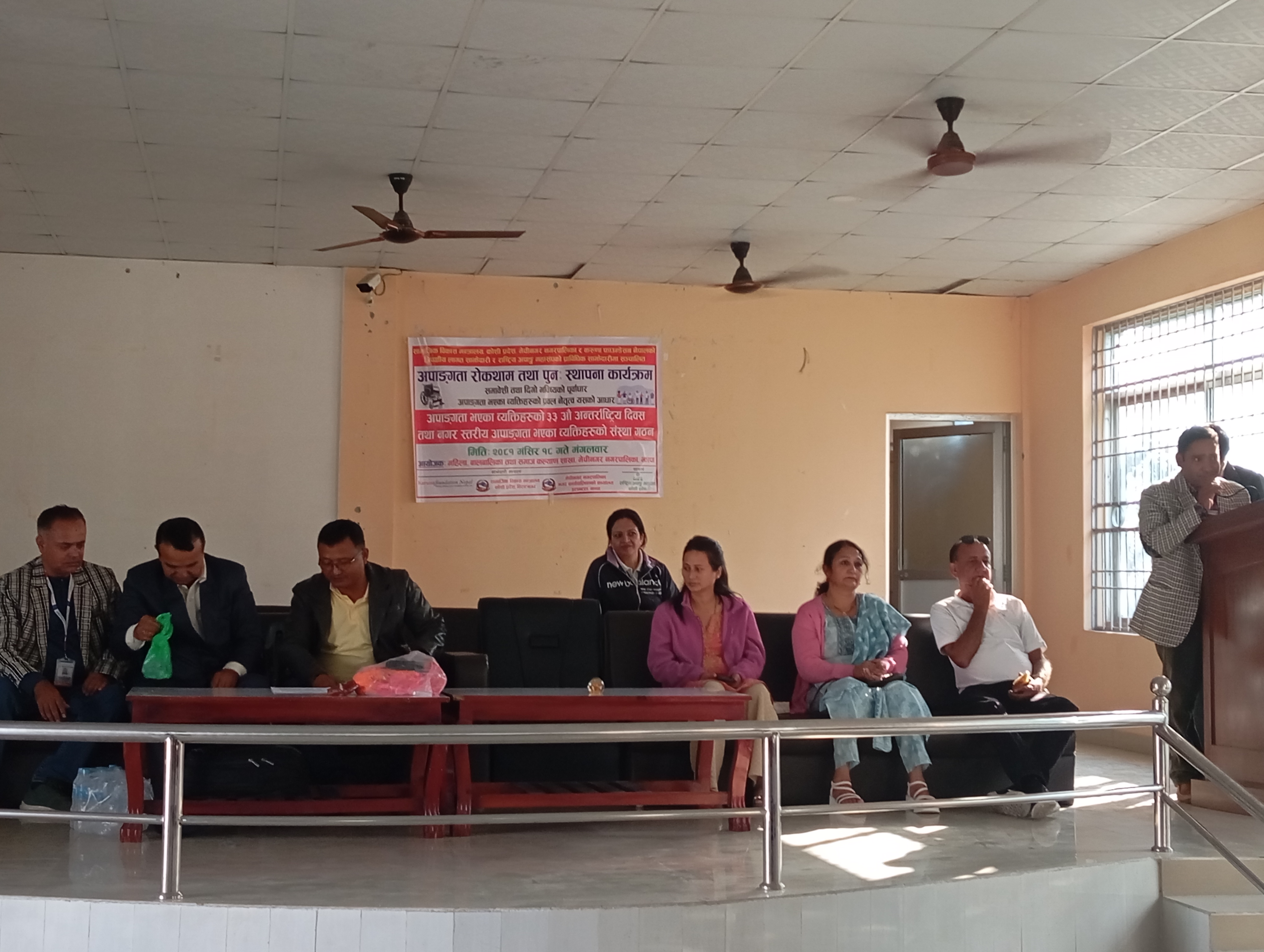 मेचीनगर नगरपालिका उपप्रमुख मिना पोखरेल उप्रेतीको सभापतित्वमा सम्पन्न कार्यक्रममा नगरपालिकाका प्रमुख प्रसाशकिय अधिकृत अग्नी प्रसाद अधिकारी,योजना तथा अनुगमन शाखा प्रमुख अन्नत प्रकाश वस्ति,राष्ट्रिय अपागं महासंघका वरिष्ठ उपाध्यक्ष राम कार्की,करुणा फाउण्डेसन सि वि आर म्यानेजर सन्तोष सुनुवार लगायतले शुभकामना मन्तव्य राख्नु भएको थियो । कार्यक्रमको सञ्चालन करुणा फाउण्डेसनका नगर संयोजक पदम बराइलीले गर्नुभएको थियो ।
