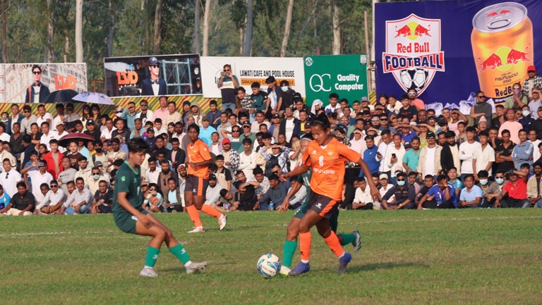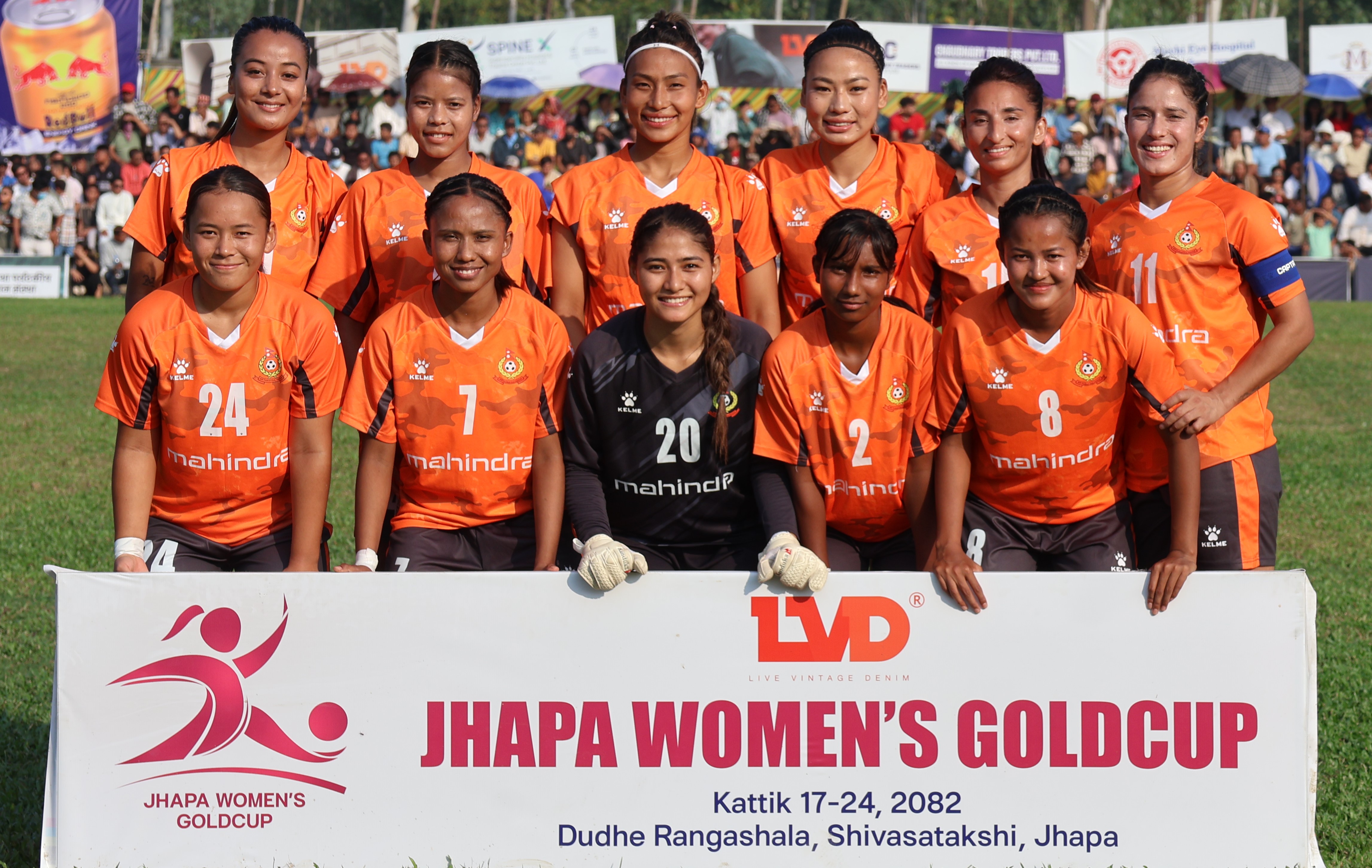 झापा, कात्तिक २३ । झापाको शिवसताक्षीस्थित दुधे रंगशालामा जारी एलभिडी प्रथम झापा महिला गोल्डकपको उपाधी भिडन्त दुई विभागिय टिमबीच हुने भएको छ । भोलि हुने फाइनलमा एपिएफ क्लव र पुलिस क्लव प्रतिस्पर्धा गर्ने भएका हुन । हिजो भएको अन्तिम सेमिफाइनलमा एपिएफ फुटबल क्लबले रोमाञ्चक जित निकालेसंगै फाइनलमा पुलिससंगको भिडन्त पक्का गरेको हो । त्रिभुवन आर्मी फुटबल क्लबलाई टाइब्रेकरमा ४–२ ले पराजित गर्दै एपिएफ फाइनल प्रवेश गरेको छ ।