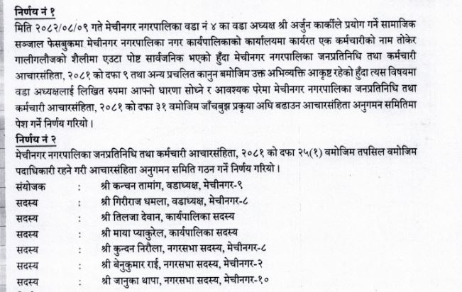ढिलो गरी सार्वजनिक गरिएको कार्यपालिकाको निर्णयमा भनिएको छ, ‘वडा अध्यक्ष अर्जुन कार्कीले प्रयोग गर्ने सामाजिक सञ्जाल फेसबुकमा मेचीनगर नगरपालिका नगरकार्यपालिकाको कार्यालयमा कार्यरत एक कर्मचारीको नाम तोकेर गालीगलौजको शैलीमा एउटा पोष्ट सार्वजनिक भएको हुँदा मेचीनगर नगरपालिका जनप्रतिनिधि तथा कर्मचारी आचारसंहिता २०८१ दफा ९ तथा अन्य प्रचलित कानून बमोजिम उक्त अभिव्यक्ति आकृष्ट रहेको हुँदा त्यस बिषयमा वडा अध्यक्षलाई लिखित रुपमा आफ्नो धारणा सोध्ने र आवश्यक परेमा मेचीनगर नगरपालिका जनप्रतिनिधि तथा कर्मचारी आचारसंहिता २०८१ दफा ३१ बमोजिम जाँचबुझ प्रकृया अगाडी बढाउन आचारसहिंता अनुगमन समितिमा पेश गर्ने निर्णय गरियो ।’
