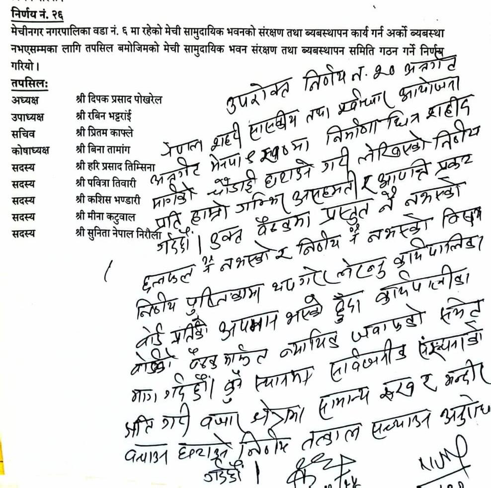 मेचीनगर वडा नं. ९ र १० मा निर्माणाधिन रहेको शहिद मार्गको चौडाई घटाउने गरी भएको कार्यपालिकाको निर्णय बिरुद्ध वडा नं ९ का वडा अध्यक्ष कञ्चन तामाङ र वडा नं. १० का वडा अध्यक्ष नारायण खनालले आपत्ति जनाउँदै लिखित असहमति राख्नु भएको हो ।